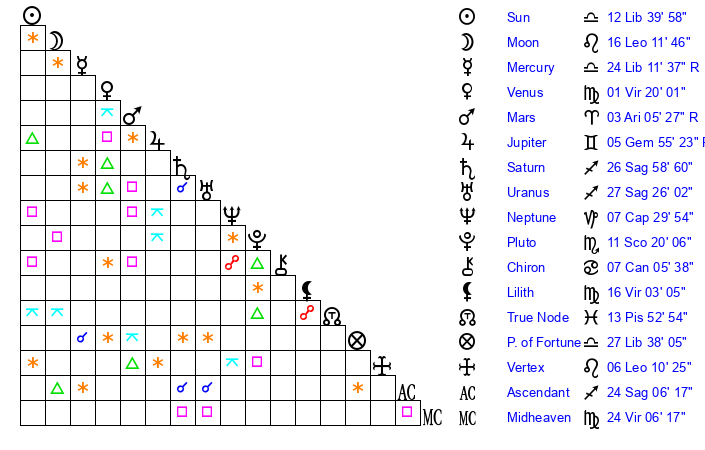 | Moon | 16 Leo 16 | 22 Pisces 50 | 14 Sagittarius 33 |