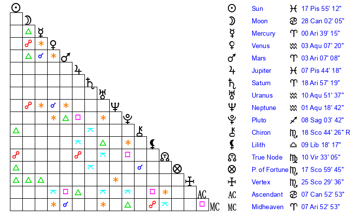 | Sun | 17 Pisces 55 | 18 Pisces 22 | 14 Aries 43 |
