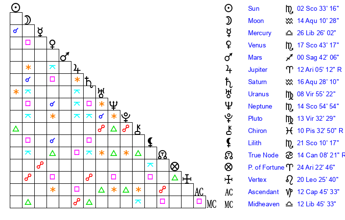 | Neptune | 14 Scorpio 54 | 29 Pisces 53 | 17 Scorpio 4 |