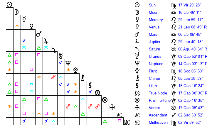 | Sun | 17 Virgo 29 | 18 Virgo 14 | 20 Libra 51 |