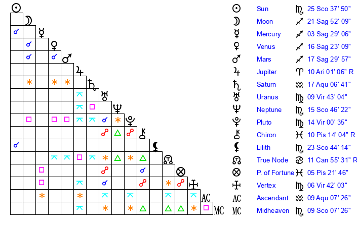 | Moon | 21 Sagittarius 57 | 9 Scorpio 28 | 26 Pisces 32 |