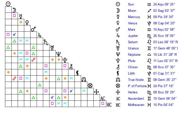 | Neptune | 10 Libra 31 | 28 Pisces 21 | 8 Libra 36 |