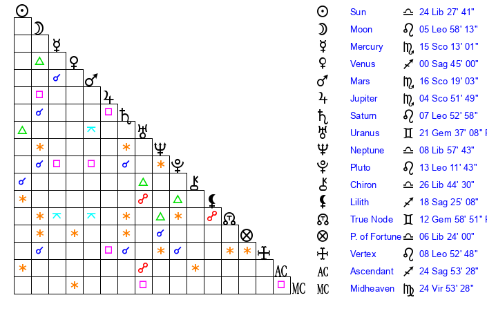 | Moon | 5 Leo 51 | 21 Virgo 10 | 19 Gemini 48 |