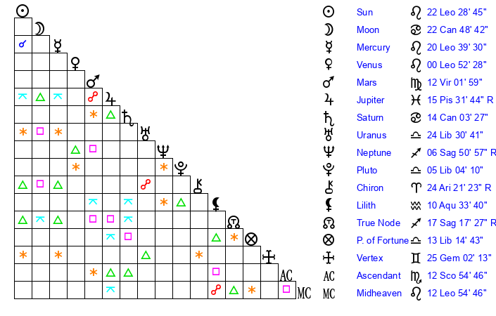 | Sun | 22 Leo 28 | 23 Leo 7 | 12 Libra 4 |