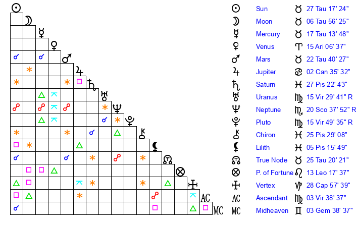 | Sun | 27 Taurus 18 | 28 Taurus 0 | 23 Cancer 42 |
