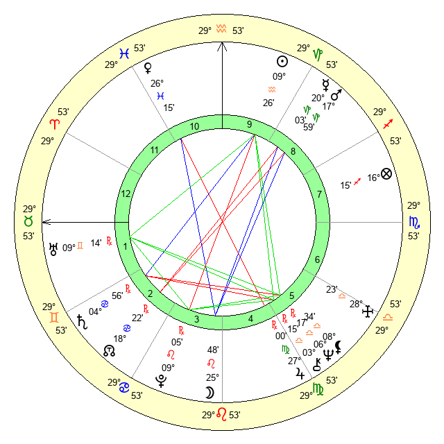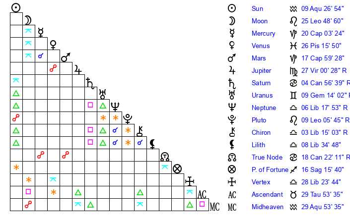 | Moon | 25 Leo 44 | 12 Aquarius 20 | 3 Leo 49 |