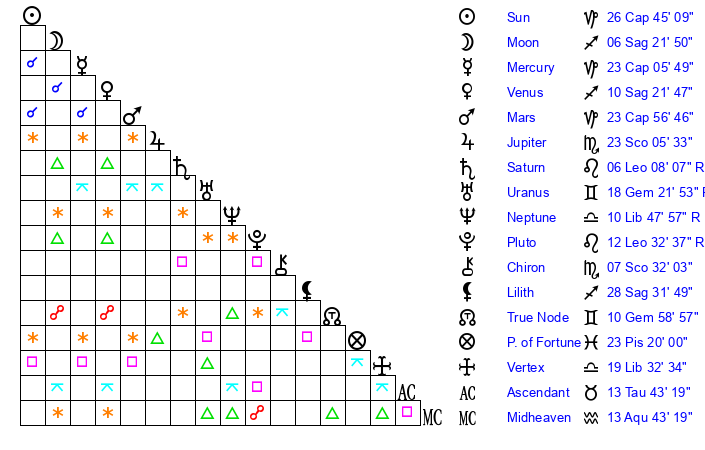 | Neptune | 10 Libra 48 | 27 Pisces 36 | 9 Libra 17 |