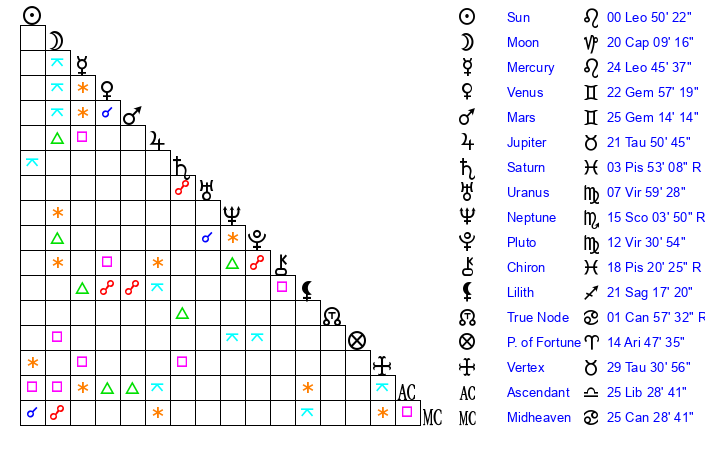 | Moon | 20 Capricorn 15 | 16 Cancer 48 | 12 Aries 5 |