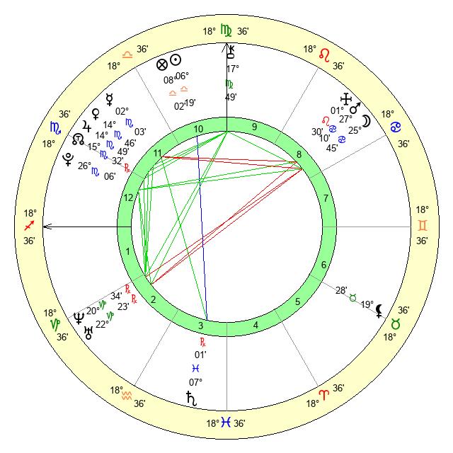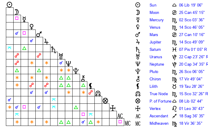 | Venus | 14 Scorpio 46 | 12 Virgo 29 | 12 Scorpio 15 |