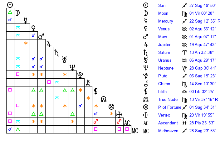 | Sun | 27 Sagittarius 50 | 28 Sagittarius 17 | 25 Capricorn 21 |