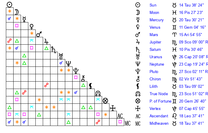 | Sun | 14 Taurus 38 | 15 Taurus 7 | 14 Gemini 29 |