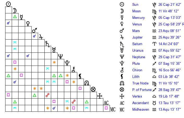 | Neptune | 29 Capricorn 31 | 27 Pisces 34 | 0 Aquarius 32 |
