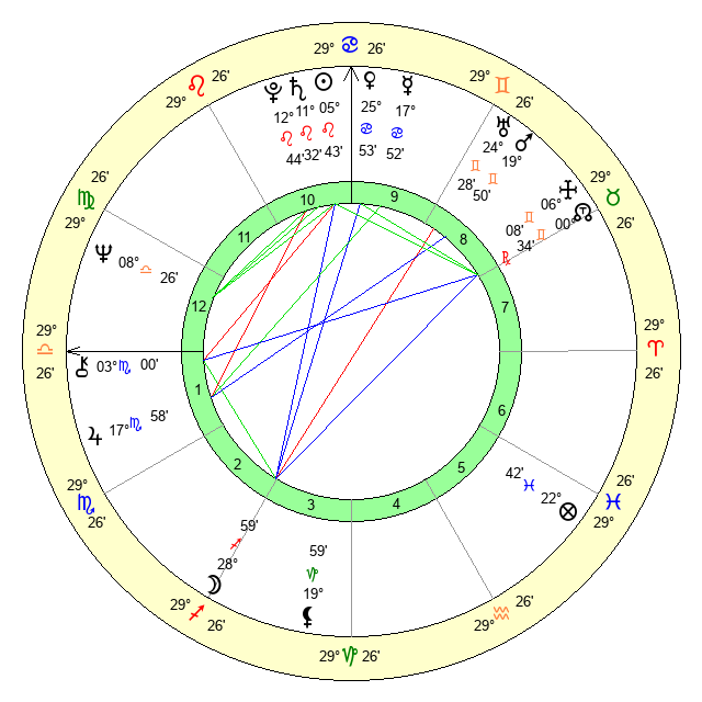| Venus | 25 Cancer 54 | 28 Gemini 19 | 2 Scorpio 40 |