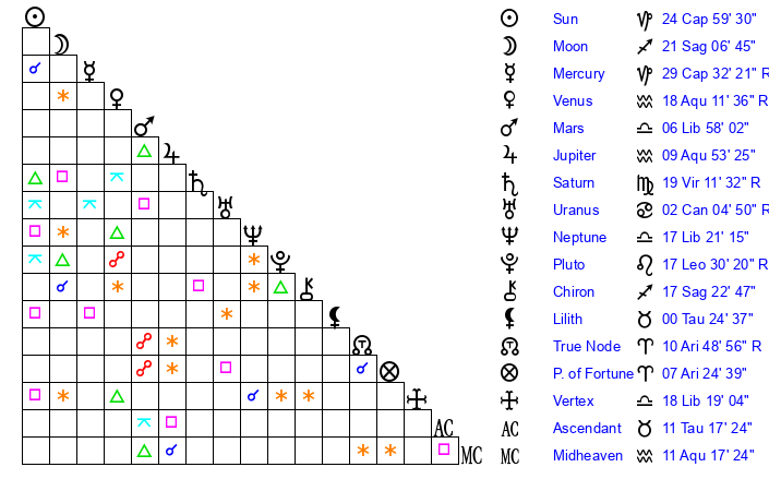 | Venus | 18 Aquarius 12 | 12 Pisces 51 | 24 Aquarius 33 |
