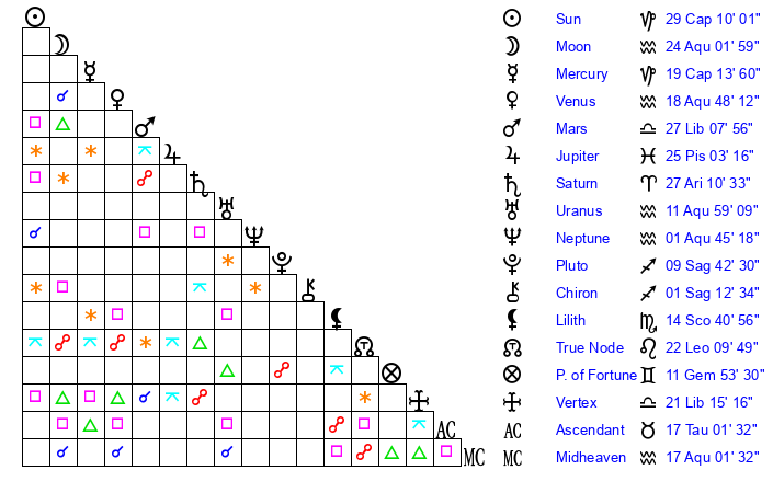| Moon | 24 Aquarius 3 | 6 Libra 37 | 6 Aquarius 2 |