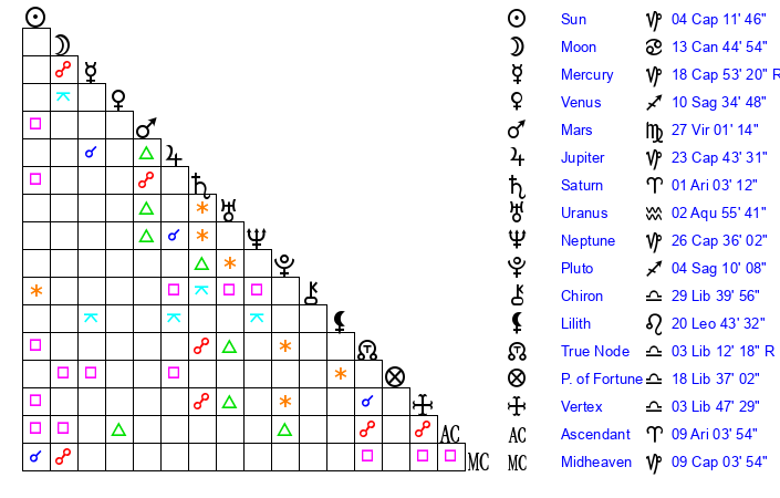 | Neptune | 26 Capricorn 36 | 27 Pisces 13 | 27 Capricorn 38 |