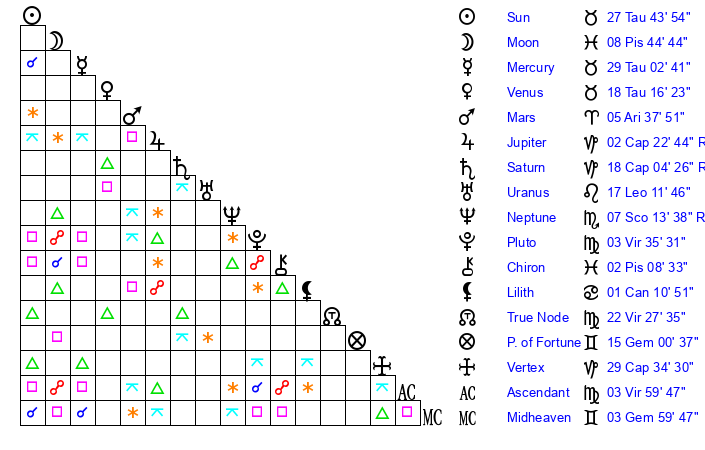 | Pluto | 3 Virgo 34 | 3 Aquarius 46 | 4 Virgo 40 |