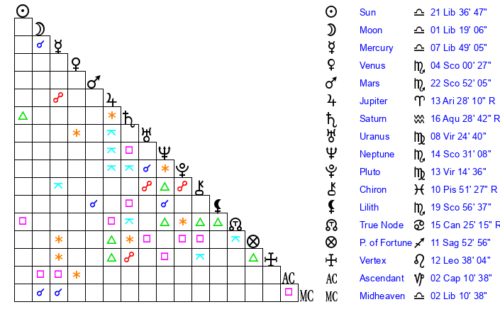 | Sun | 21 Libra 37 | 22 Libra 35 | 24 Sagittarius 1 |