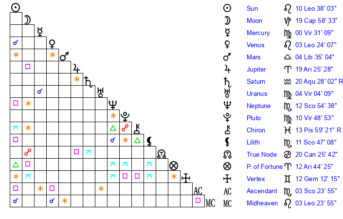 | Pluto | 10 Virgo 49 | 2 Aquarius 21 | 12 Virgo 55 |