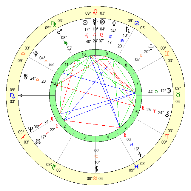 | Mercury | 10 Leo 25 | 4 Leo 16 | 2 Scorpio 50 |