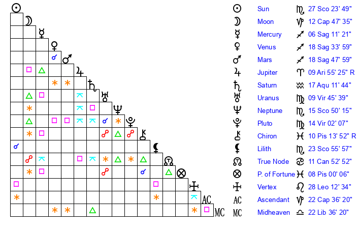 | Sun | 27 Scorpio 24 | 28 Scorpio 22 | 0 Aquarius 26 |