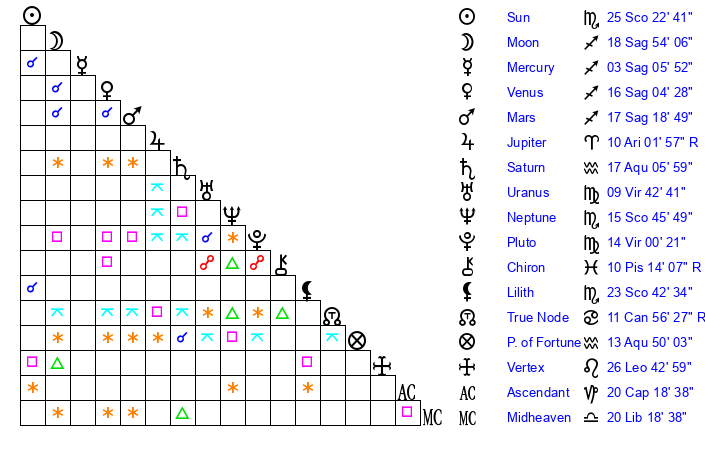 | Moon | 18 Sagittarius 59 | 6 Scorpio 30 | 23 Pisces 10 |