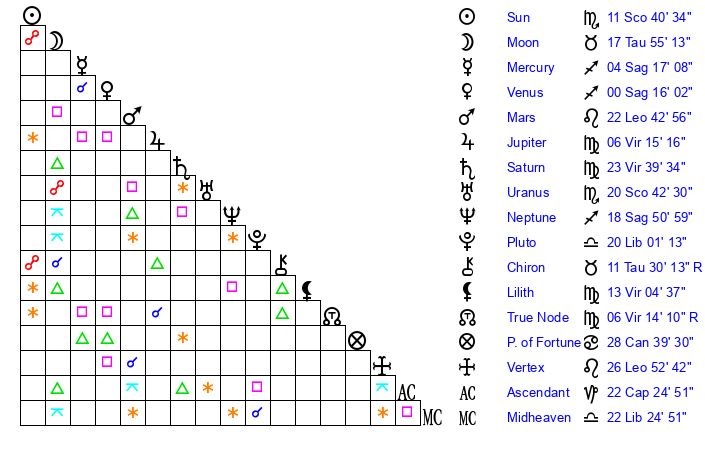 | Sun | 11 Scorpio 41 | 12 Scorpio 32 | 28 Sagittarius 13 |