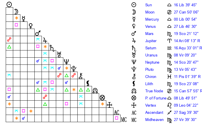 | Venus | 27 Libra 47 | 26 Virgo 3 | 15 Capricorn 1 |