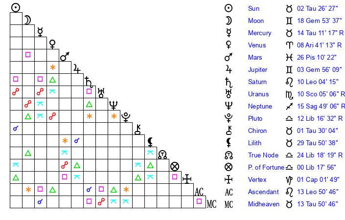 | Sun | 2 Taurus 26 | 2 Taurus 49 | 18 Gemini 44 |