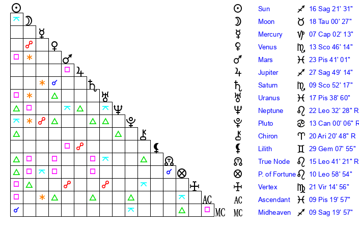 | Sun | 16 Sagittarius 22 | 16 Sagittarius 51 | 28 Pisces 35 |