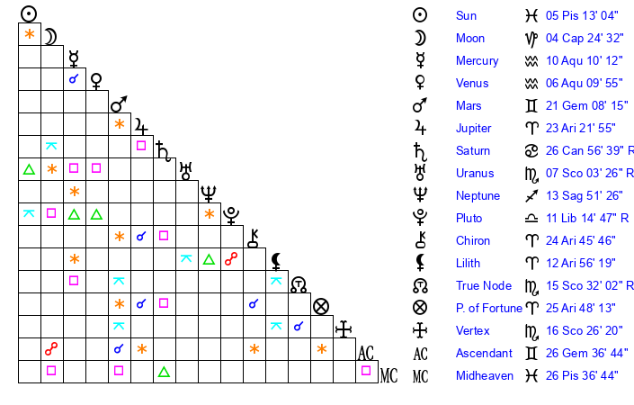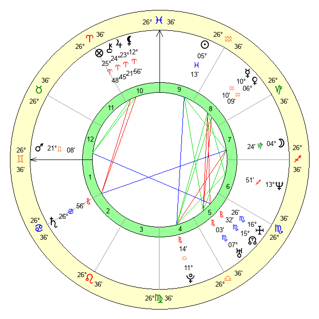 | Sun | 5 Pisces 13 | 6 Pisces 20 | 23 Aries 53 |