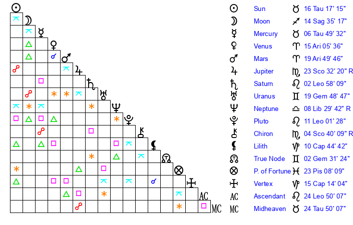| Sun | 16 Taurus 17 | 17 Taurus 23 | 0 Leo 57 |