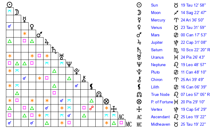 | Sun | 19 Taurus 13 | 20 Taurus 0 | 24 Leo 55 |