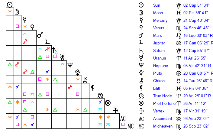 | Venus | 24 Scorpio 46 | 20 Aquarius 30 | 27 Aquarius 10 |