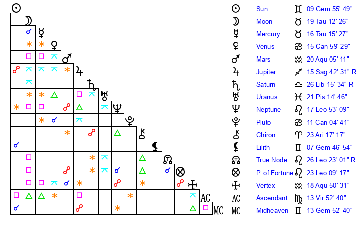 | Sun | 9 Gemini 56 | 10 Gemini 29 | 16 Virgo 43 |