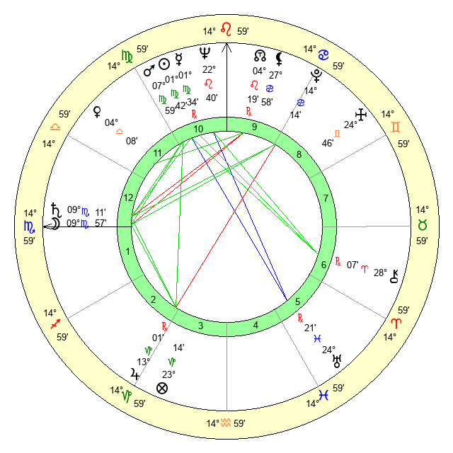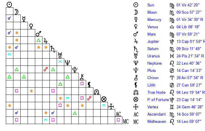| Moon | 9 Scorpio 56 | 28 Virgo 19 | 15 Cancer 58 |