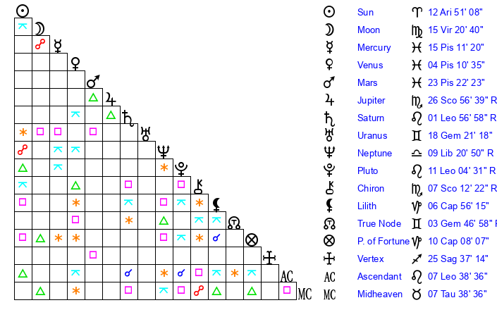 | Sun | 12 Aries 51 | 13 Aries 56 | 28 Gemini 17 |