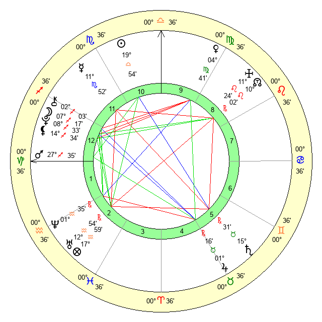 | Moon | 7 Sagittarius 24 | 19 Cancer 52 | 21 Scorpio 51 |