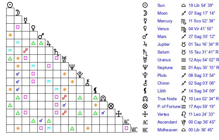 | Moon | 7 Sagittarius 24 | 19 Cancer 52 | 21 Scorpio 51 |
