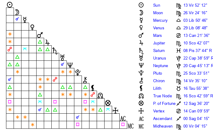 | Moon | 26 Virgo 18 | 0 Pisces 37 | 19 Scorpio 27 |
