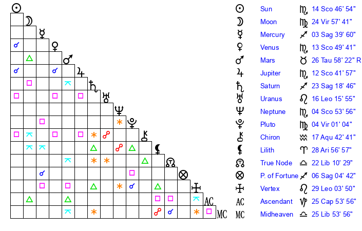 | Venus | 13 Scorpio 50 | 0 Scorpio 57 | 7 Aquarius 59 |