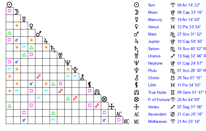| Mercury | 19 Aries 15 | 4 Aries 31 | 26 Aries 19 |