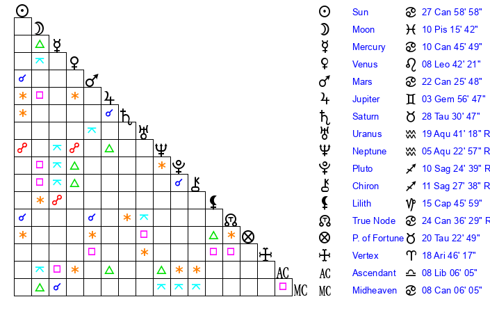 Mars | 22 Cancer 26 | 19 Virgo 15 | 8 Leo 37 |
