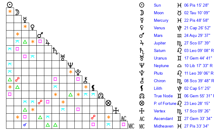 | Sun | 6 Pisces 15 | 7 Pisces 20 | 23 Taurus 3 |