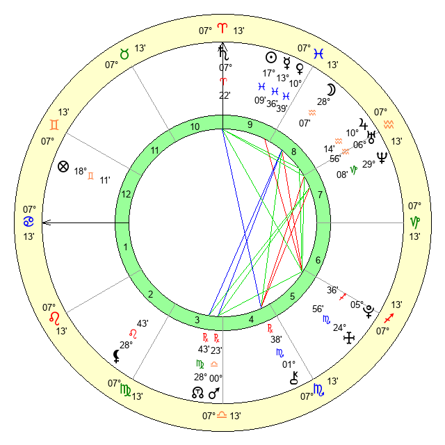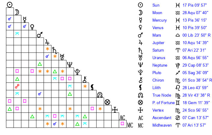 | Moon | 28 Aquarius 14 | 0 Cancer 21 | 7 Pisces 4 |