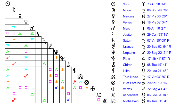 | Saturn | 8 Virgo 4 | 25 Pisces 54 | 7 Virgo 49 |