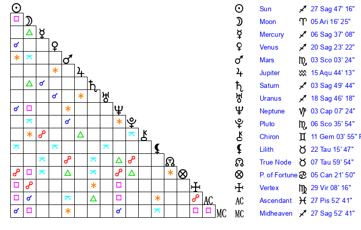| Sun | 27 Sagittarius 47 | 28 Sagittarius 20 | 7 Aquarius 31 |