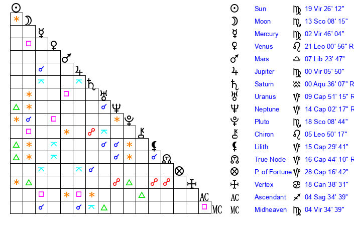 | Mercury | 2 Virgo 46 | 19 Virgo 31 | 1 Scorpio 48 |