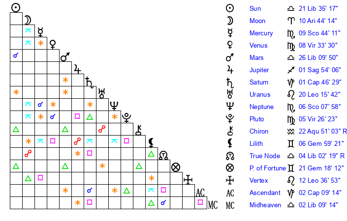 | Sun | 21 Libra 35 | 22 Libra 35 | 28 Sagittarius 4 |