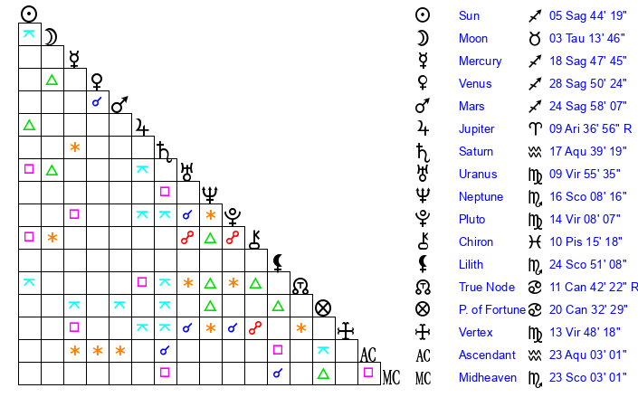 | Sun | 5 Sagittarius 45 | 6 Sagittarius 43 | 8 Aquarius 50 |